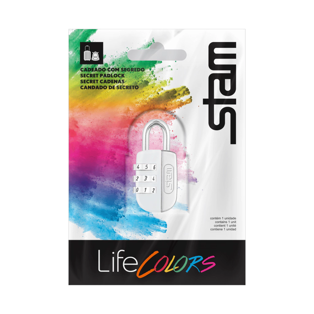 O cadeado Stam life colors possui troca de segredo simplificada, ideal para malas e mochilas, com design elegante.