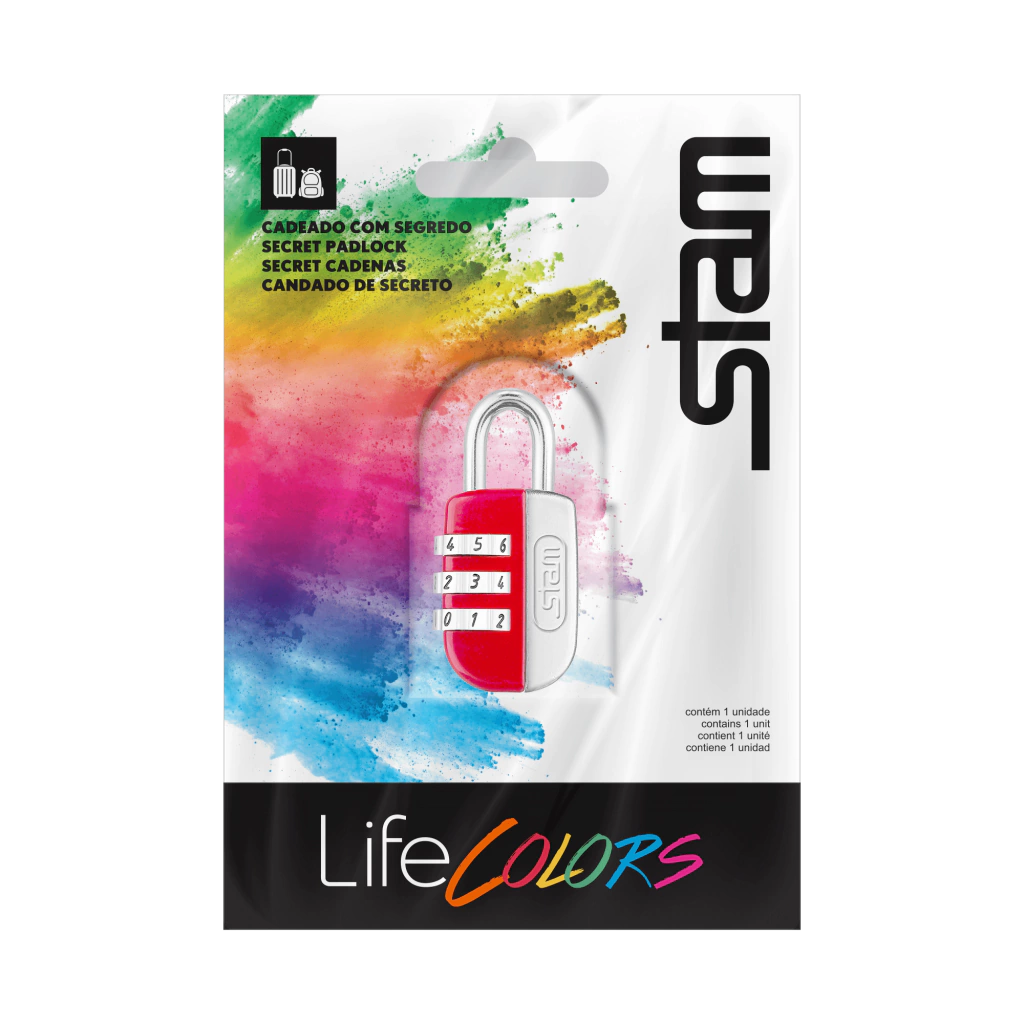 O cadeado Stam life colors possui troca de segredo simplificada, ideal para malas e mochilas, com design elegante.